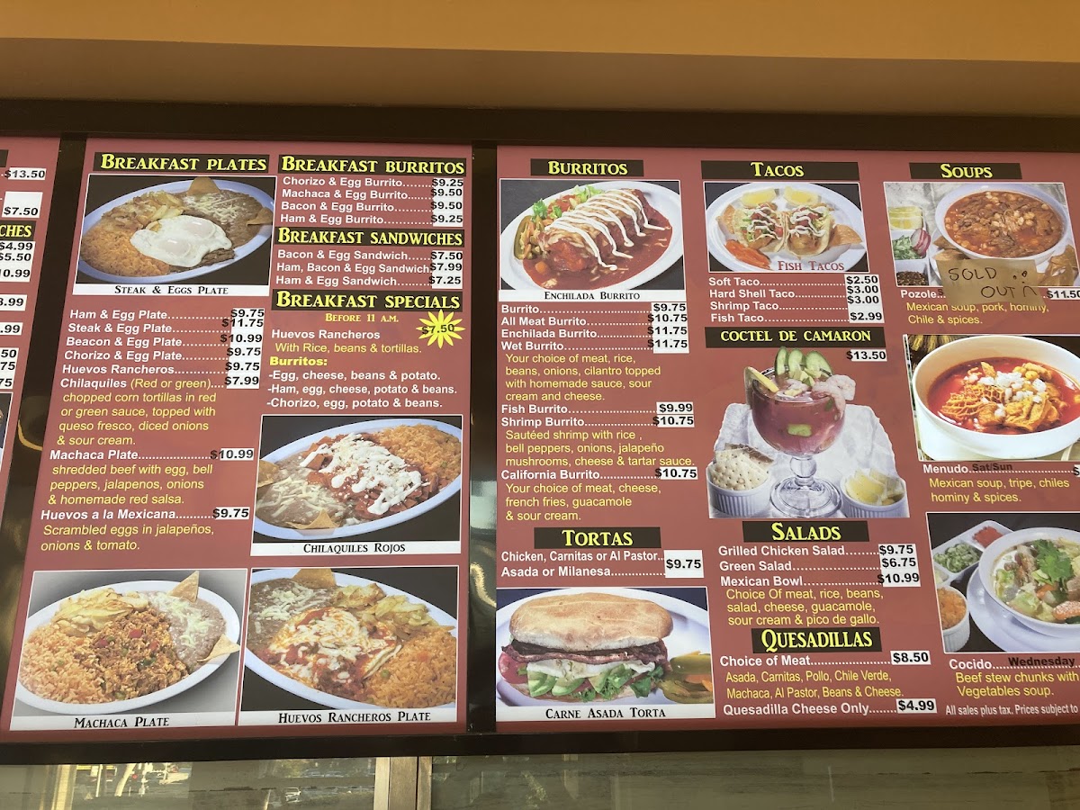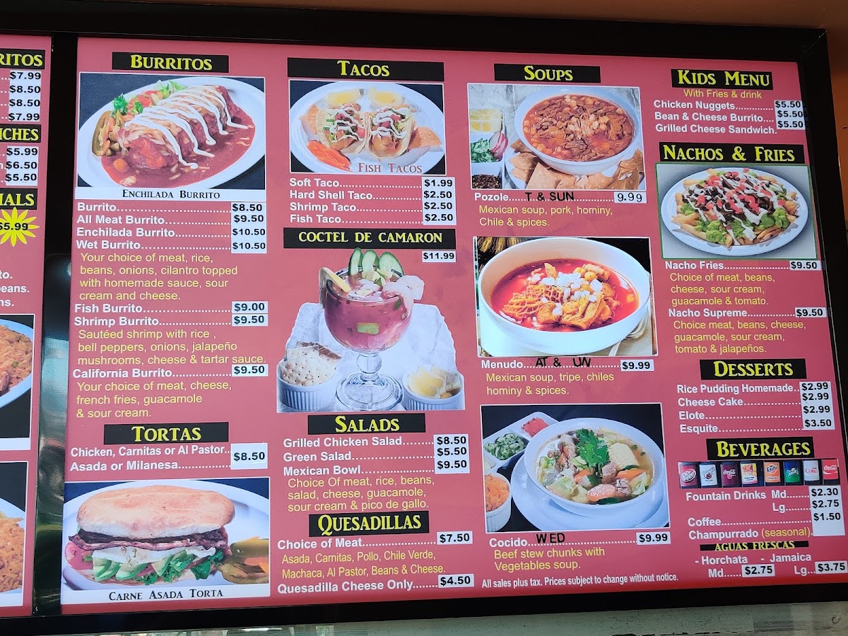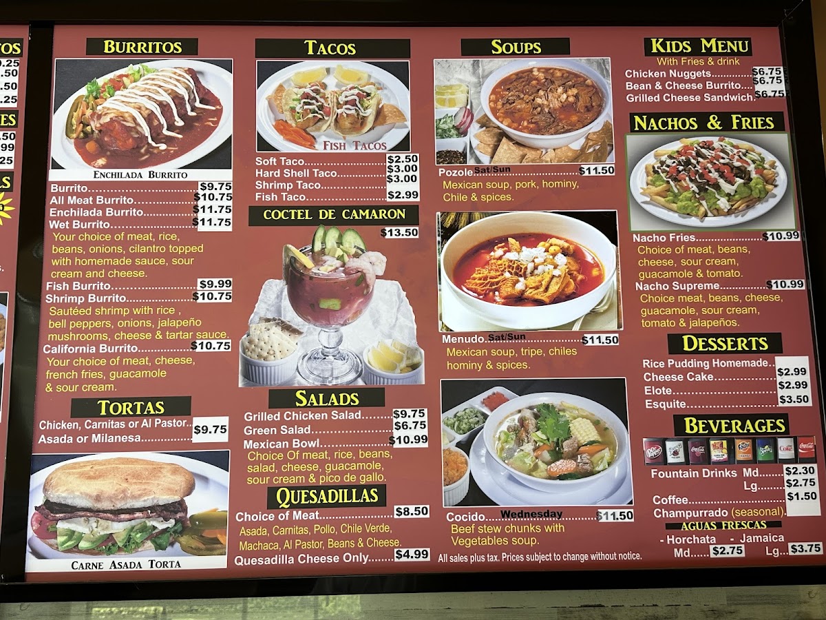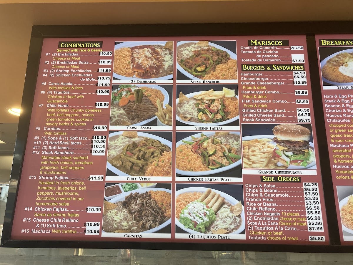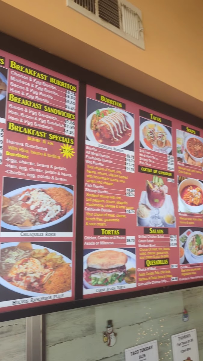 The menu supports quick ordering and casual dining, with a focus on classic Mexican fare served in portion sizes appropriate for both individual meals and shared plates. Guests can expect a range of protein options including beef, chicken, pork, and fish, often accompanied by traditional sides like Spanish rice, beans, and fresh salsas.